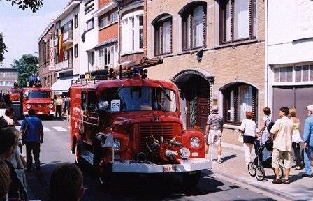"Wat is er aan de hand, heren?" vraag ik door het raampje. "Wat er aan de hand is?" vraagt een gehelmd hoofd voor het raam, "Ge zeit toch een brandweerwagen, ge moet met ons mee. We halen hier alle brandweerwagens van de weg en brengen ze naar de stoet". We begrepen eerst niet wat ons overkwam, meerijden in een stoet? Wat bedoelde die kerel? "We zijn onderweg naar Frankrijk" zei ik "wat bedoel je eigenlijk?' Even later werd het ons duidelijk. Iets verder lag het plaatsje Niel. De brandweer bestond 170 jaar en voor die gelegenheid was er een optocht georganiseerd. Uit verschillende landen, Frankrijk, Duitsland en ook Nederland kwamen brandweerauto's naar Niel. De plaatselijke motorclub was verzocht om de auto's naar een industrieterrein te begeleiden waar de stoet opgesteld werd op bouwjaar. Lachend namen we afscheid van de motorrijders, die ons verbaasd nastaarden. Ik zag ze denken. 'Stomme Hollanders, wie gaat er nu op vakantie in een brandweerauto." Na getankt te hebben reden we richting Niel. De man had ons verteld dat het hele dorp was afgesloten maar we wilden deze kans niet laten lopen. We hadden de Arend Fox, een van de mooiste Nederlandse brandweerwagens, al langs zien komen. Toen we bij Niel aankwamen was het net alsof ze ons stonden op te wachten. Het was een drukte van jewelste. De straten stonden aan weerszijden vol met geparkeerde auto's. Honderden mensen liepen in de richting van het centrum. Toen we het centrum naderden werd voor ons de wegafzetting verwijderd. Enkele agenten wenken. Doorrijden. Achter ons hoorden we motoren, sirenes loeiden en er klonken bellen. Er kwamen nog meer brandweerauto's aan. Weer werden wegafzettingen verwijderd en we werden naar een industrieterrein gebracht. In een lange rij stonden diverse oude brandweerwagens te wachten. Een ieder kreeg een nummer uitgereikt. Toen kwamen wij aan de beurt. Ik had ze al even zien kijken. Ze had een papier in de hand en controleerde het met ons kenteken. Ik zag dat het niet klopte. Allicht niet, wij stonden er niet op. We hadden al voorpret voor tien.
